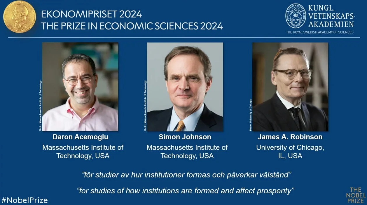এ বছর অর্থনীতিতে নোবেল পুরস্কার জিতেছেন মার্কিন তিন শিক্ষাবিদ। তারা হলেন তুর্কি-মার্কিন নাগরিক ড্যারন অ্যাসেমোগ্লু এবং যুক্তরাষ্ট্রের সাইমন জনসন ও জেমস এ. রবিনসন।
