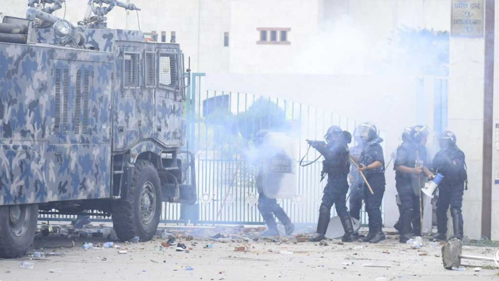 প্রশাসন জানায়, সোমবার (৮ সেপ্টেম্বর) দুপুরে বিক্ষোভকারীরা কারফিউ ভঙ্গ করে সংসদ ভবনের ভেতরে প্রবেশ করলে সংঘর্ষ ছড়িয়ে পড়ে। এ সময় পুলিশ টিয়ার গ্যাস, জলকামান ও রাবার বুলেট ব্যবহার করে পরিস্থিতি নিয়ন্ত্রণের চেষ্টা করে। অন্যদিকে গাছের ডাল ও পানির বোতল ছুড়ে সরকারবিরোধী স্লোগান দেন বিক্ষোভকারীরা।