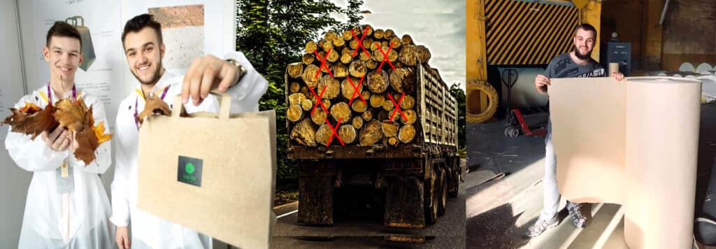 ঝরা পাতায় কাগজের ব্যাগ: এই প্রক্রিয়ায়, প্রথমত, ঝরা পাতা সংগ্রহ করা হয়। পাতাগুলো পরিষ্কার করা হয়, পরে এদের আঁশ বের করে নেওয়া হয় এবং দানায় পরিণত করা হয়। এই পদ্ধতিতে এগুলো সহজে সংরক্ষণ করা যায় এবং সারা বছর ব্যবহার করা যায়। এই দানাগুলোর সঙ্গে একধরনের জৈবিক উপাদান মিশিয়ে একটি আঁশালো মন্ড তৈরি করা হয়। এরপর এটিকে চাপ দিয়ে সমান করা হয় এবং শুকিয়ে রোল করা হয়। এভাবে তৈরি কাগজ কেটে পরবর্তীতে ব্যাগ তৈরি করা হয়