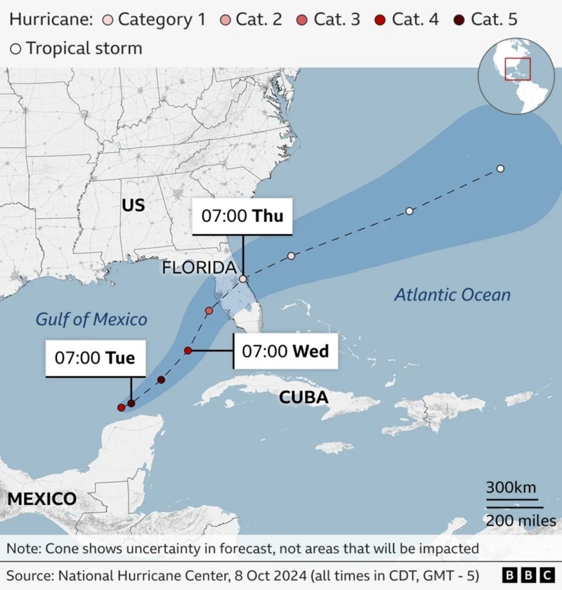 মার্কিন আবহাওয়া দপ্তরের পূর্বাভাস বলছে, স্থানীয় সময় বুধবার রাতে ফ্লোরিডার জনবহুল টাম্পা বে’র উপকূলে আছড়ে পড়তে পারে মিল্টন।