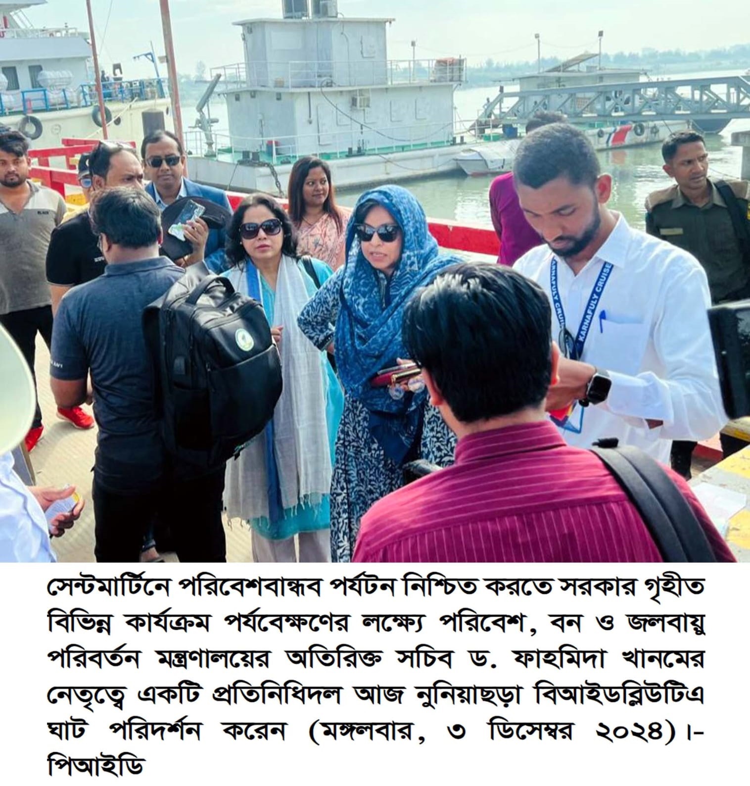 এদিকে, সেন্ট মার্টিনে পরিবেশবান্ধব পর্যটন নিশ্চিত করতে সরকার গৃহীত বিভিন্ন কার্যক্রম পর্যবেক্ষণের লক্ষ্যে পরিবেশ, বন ও জলবায়ু পরিবর্তন মন্ত্রণালয়ের অতিরিক্ত সচিব (পরিবেশ) ড. ফাহমিদা খানম এর নেতৃত্বে মঙ্গলবার, ৩ ডিসেম্বর ২০২৪ একটি প্রতিনিধিদল নুনিয়াছড়া বিআইডব্লিউটিএ ঘাঁট পরিদর্শন করেছেন।”