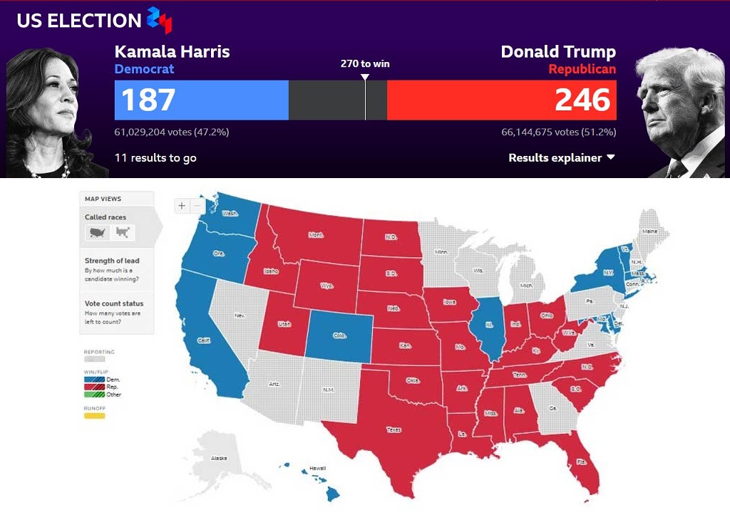 যুক্তরাষ্ট্রের প্রেসিডেন্ট নির্বাচনে প্রায় সব অঙ্গরাজ্যের ভোটগ্রহণ শেষ হয়েছে। এখন চলছে ভোট গণনা। ইতিমধ্যে অধিকাংশ অঙ্গরাজ্যে কে জয় পেতে যাচ্ছেন,